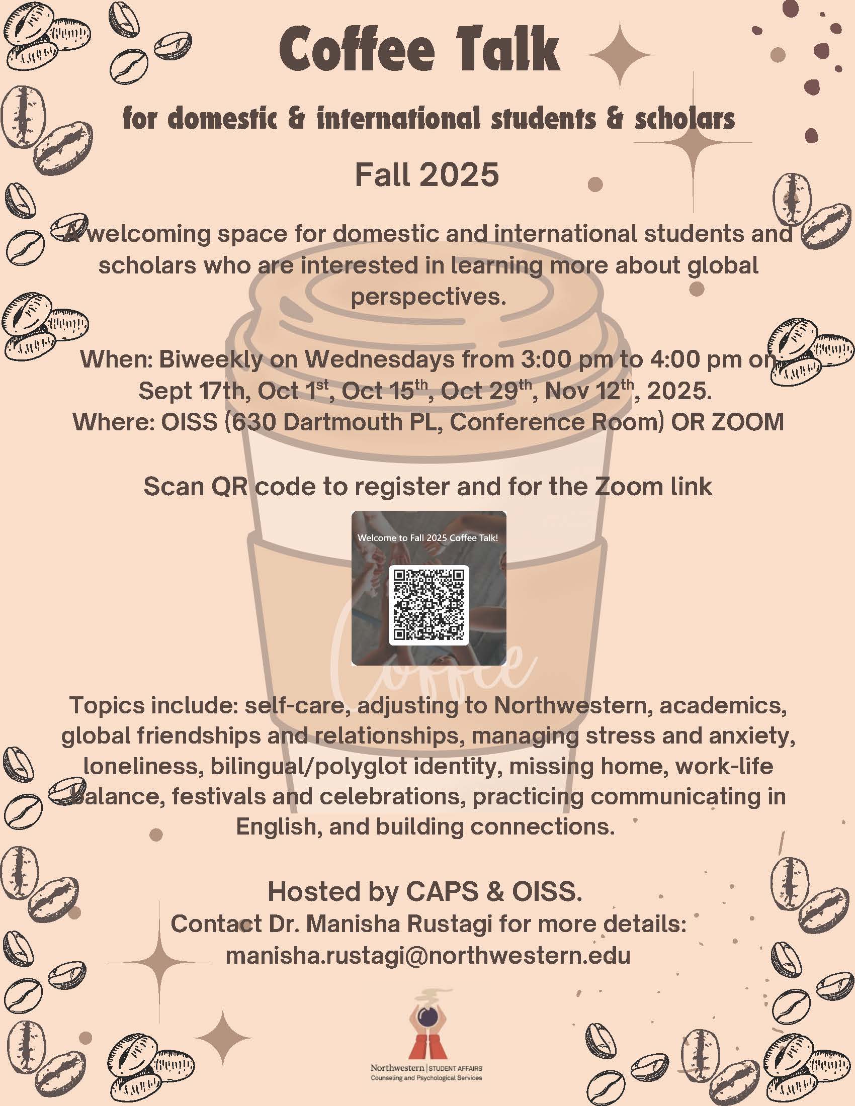 Coffee Talk is a monthly gathering space for all to discuss topics around international student wellness. On the Chicago campus, it is known as the "Fika Time." The gatherings are hosted by Chicago CAPS staff to help facilitate meaningful conversations where one can share their experiences. We are looking forward to sharing space, having coffee, tea, and treats with you!