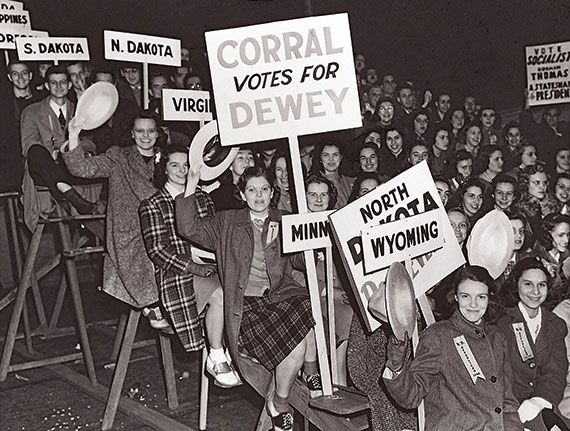 Delegates show their support for Republican presidential candidate Thomas Dewey at the 1940 Mock Political Convention on Roycemore Field (now Long Field).