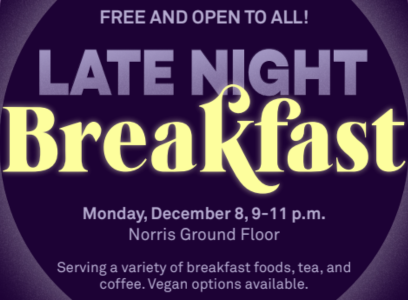 Take a break from studying and join us for late night breakfast at Norris! Fill up on eggs, pancakes, bacon, baked goods, coffee, and more! Vegan options available. While supplies last. Free and open to all NU students.