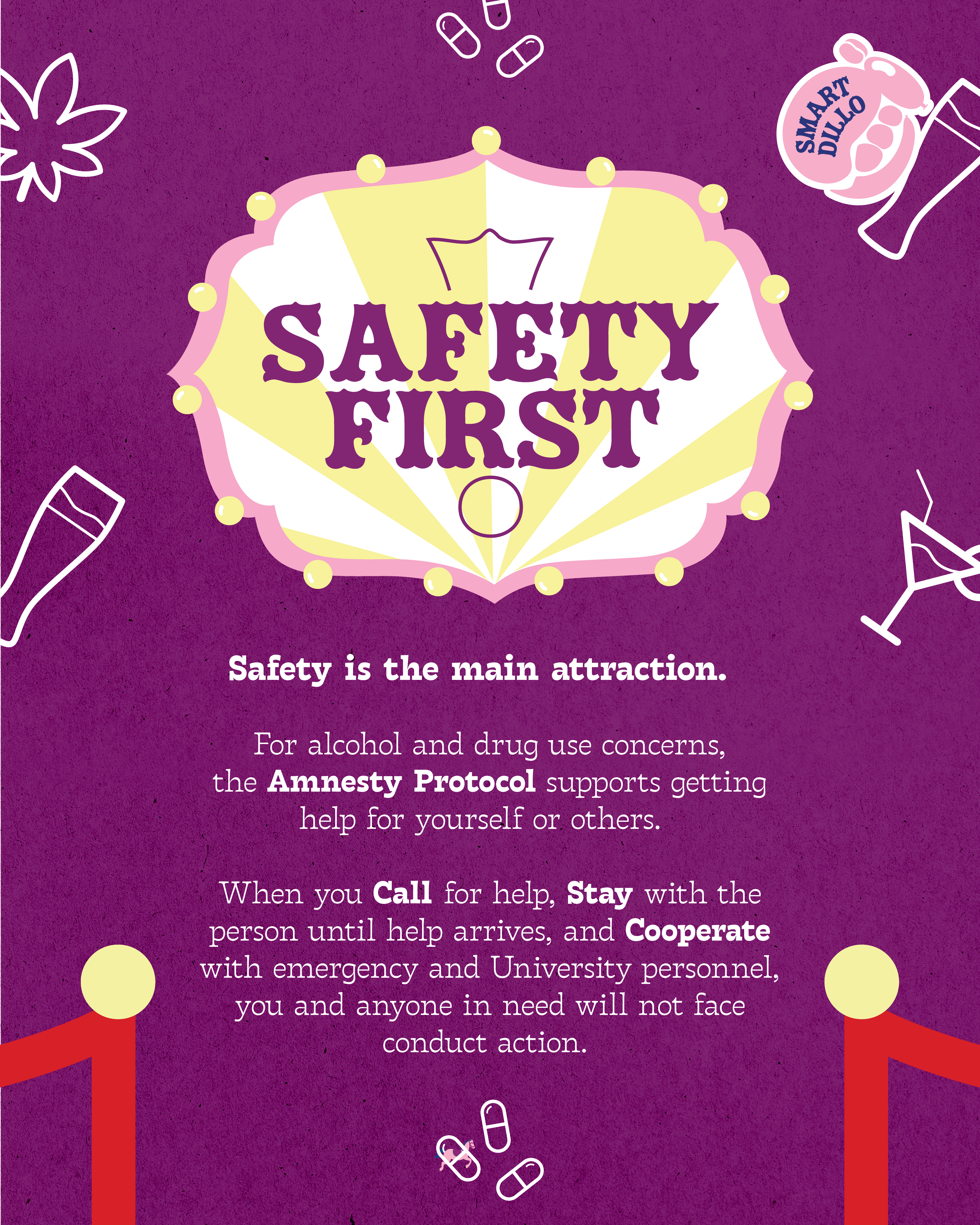 Call for help, Stay with the person until help arrives, and Cooperate with any emergency or university personnel, you and anyone in need will not face conduct action related to drugs or alcohol.